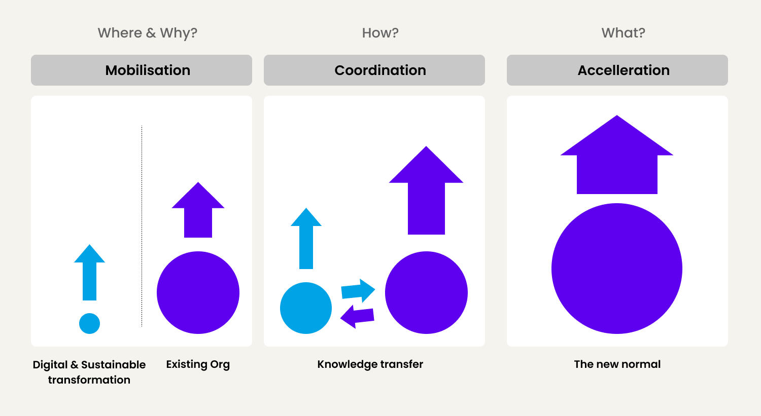 Each program follows a structured method inspired by the DigJourney framework, working in three connected phases: Mobilisation, Coordination, and Acceleration.