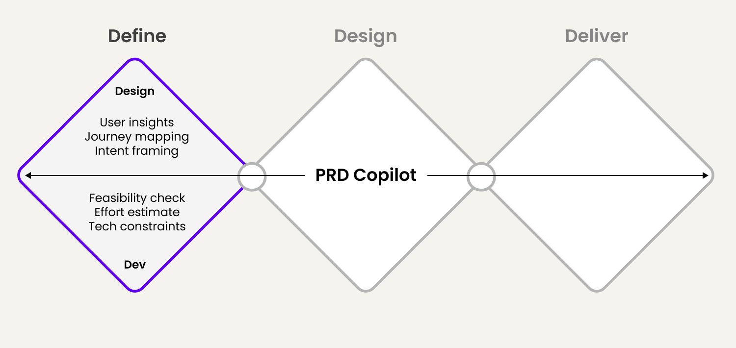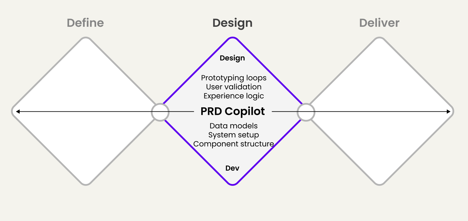 Connected to your product management process, the PRD used as a Copilot can act as the connective tissue that holds together modern product work for all your stakeholders. I have broken down the Triple Diamond into a reference example of how you can benefit from the PRD in each phase.